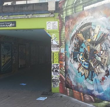 The Bear Pit is an iconic underpass area that separates Stokes Croft from the city centre. Over the years, it has transformed into a hub for pop-up shops, makeshift cafés, and public performances, making it a natural home for experimental and independent artistic expression. With this in mind, I saw an opportunity to turn the space into an impromptu outdoor gallery, where my work could be seen by the public in a raw and unfiltered way.